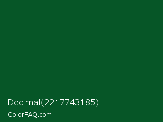 Decimal 2217743185 Color is a very dark green color and the nearest color is Camarone #00581a. Hex code #065627 and RGB value is rgb(6,86,39). In RGB color space, this color is composed of 2% red, 34% green, 15% blue, In CMYK color space, this color is composed of 93% cyan, 0% magenta, 55% yellow , 66% black , In HSL color space, this color has a hue angle of 145° , 87% saturation and 18% lightness.