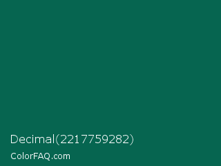Decimal 2217759282 Color is a very dark cyan color and the nearest color is Bottle Green #006a4e. Hex code #066550 and RGB value is rgb(6,101,80). In RGB color space, this color is composed of 2% red, 40% green, 31% blue, In CMYK color space, this color is composed of 94% cyan, 0% magenta, 21% yellow , 60% black , In HSL color space, this color has a hue angle of 167° , 89% saturation and 21% lightness.