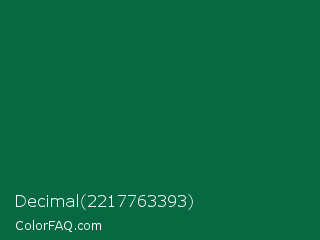 Decimal 2217763393 Color is a very dark green color and the nearest color is Cadmium Green #006b3c. Hex code #066941 and RGB value is rgb(6,105,65). In RGB color space, this color is composed of 2% red, 41% green, 25% blue, In CMYK color space, this color is composed of 94% cyan, 0% magenta, 38% yellow , 59% black , In HSL color space, this color has a hue angle of 156° , 89% saturation and 22% lightness.