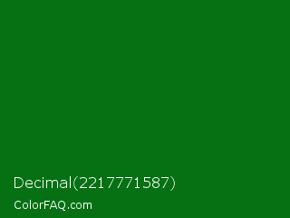 Decimal 2217771587 Color is a dark green color and the nearest color is Deep Green #056608. Hex code #067113 and RGB value is rgb(6,113,19). In RGB color space, this color is composed of 2% red, 44% green, 7% blue, In CMYK color space, this color is composed of 95% cyan, 0% magenta, 83% yellow , 56% black , In HSL color space, this color has a hue angle of 127° , 90% saturation and 23% lightness.