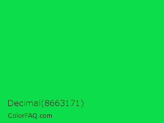 Decimal 8663171 Color is a normal green color and the nearest color is Malachite #0bda51. Hex code #0cdd4b and RGB value is rgb(12,221,75). In RGB color space, this color is composed of 5% red, 87% green, 29% blue, In CMYK color space, this color is composed of 95% cyan, 0% magenta, 66% yellow , 13% black , In HSL color space, this color has a hue angle of 138° , 90% saturation and 46% lightness.