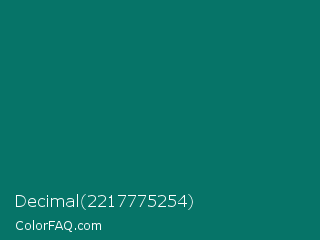 Decimal 2217775254 Color is a dark cyan color and the nearest color is Pine Green #01796f. Hex code #067468 and RGB value is rgb(6,116,104). In RGB color space, this color is composed of 2% red, 45% green, 41% blue, In CMYK color space, this color is composed of 95% cyan, 0% magenta, 10% yellow , 55% black , In HSL color space, this color has a hue angle of 173° , 90% saturation and 24% lightness.