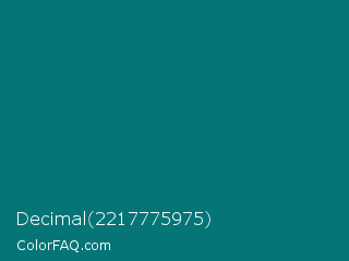 Decimal 2217775975 Color is a dark cyan color and the nearest color is Skobeloff #007474. Hex code #067577 and RGB value is rgb(6,117,119). In RGB color space, this color is composed of 2% red, 46% green, 47% blue, In CMYK color space, this color is composed of 95% cyan, 2% magenta, 0% yellow , 53% black , In HSL color space, this color has a hue angle of 181° , 90% saturation and 25% lightness.