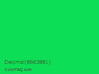 Decimal 8663881 Color is a normal green color and the nearest color is Malachite #0bda51. Hex code #0cde55 and RGB value is rgb(12,222,85). In RGB color space, this color is composed of 5% red, 87% green, 33% blue, In CMYK color space, this color is composed of 95% cyan, 0% magenta, 62% yellow , 13% black , In HSL color space, this color has a hue angle of 141° , 90% saturation and 46% lightness.