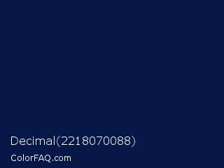 Decimal 2218070088 Color is a very dark blue color and the nearest color is Oxford Blue #002147. Hex code #071848 and RGB value is rgb(7,24,72). In RGB color space, this color is composed of 3% red, 9% green, 28% blue, In CMYK color space, this color is composed of 90% cyan, 67% magenta, 0% yellow , 72% black , In HSL color space, this color has a hue angle of 224° , 82% saturation and 15% lightness.