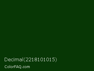 Decimal 2218101015 Color is a very dark green color and the nearest color is Deep Fir #002900. Hex code #073705 and RGB value is rgb(7,55,5). In RGB color space, this color is composed of 3% red, 22% green, 2% blue, In CMYK color space, this color is composed of 87% cyan, 0% magenta, 91% yellow , 78% black , In HSL color space, this color has a hue angle of 118° , 83% saturation and 12% lightness.