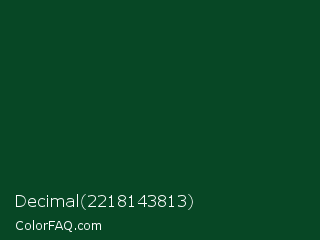 Decimal 2218143813 Color is a very dark green color and the nearest color is Forest Green #014421. Hex code #074725 and RGB value is rgb(7,71,37). In RGB color space, this color is composed of 3% red, 28% green, 15% blue, In CMYK color space, this color is composed of 90% cyan, 0% magenta, 48% yellow , 72% black , In HSL color space, this color has a hue angle of 148° , 82% saturation and 15% lightness.