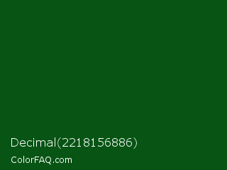 Decimal 2218156886 Color is a very dark green color and the nearest color is Camarone #00581a. Hex code #075414 and RGB value is rgb(7,84,20). In RGB color space, this color is composed of 3% red, 33% green, 8% blue, In CMYK color space, this color is composed of 92% cyan, 0% magenta, 76% yellow , 67% black , In HSL color space, this color has a hue angle of 130° , 85% saturation and 18% lightness.