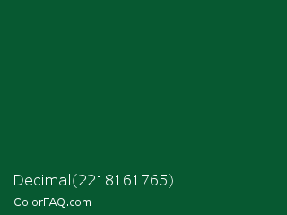 Decimal 2218161765 Color is a very dark green color and the nearest color is Sacramento State Green #00563f. Hex code #075931 and RGB value is rgb(7,89,49). In RGB color space, this color is composed of 3% red, 35% green, 19% blue, In CMYK color space, this color is composed of 92% cyan, 0% magenta, 45% yellow , 65% black , In HSL color space, this color has a hue angle of 151° , 85% saturation and 19% lightness.