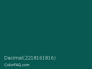 Decimal 2218161816 Color is a very dark cyan color and the nearest color is Deep Sea Green #095859. Hex code #075952 and RGB value is rgb(7,89,82). In RGB color space, this color is composed of 3% red, 35% green, 32% blue, In CMYK color space, this color is composed of 92% cyan, 0% magenta, 8% yellow , 65% black , In HSL color space, this color has a hue angle of 175° , 85% saturation and 19% lightness.