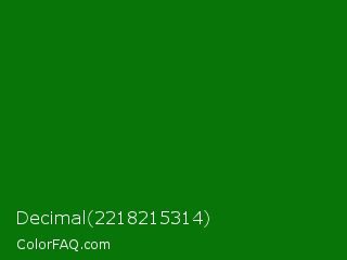 Decimal 2218215314 Color is a dark green color and the nearest color is Japanese Laurel #0a6906. Hex code #077508 and RGB value is rgb(7,117,8). In RGB color space, this color is composed of 3% red, 46% green, 3% blue, In CMYK color space, this color is composed of 94% cyan, 0% magenta, 93% yellow , 54% black , In HSL color space, this color has a hue angle of 121° , 89% saturation and 24% lightness.