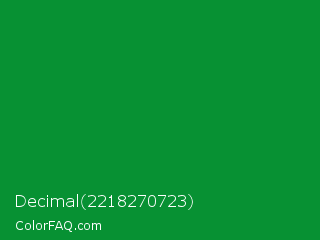 Decimal 2218270723 Color is a dark green color and the nearest color is North Texas Green #059033. Hex code #079133 and RGB value is rgb(7,145,51). In RGB color space, this color is composed of 3% red, 57% green, 20% blue, In CMYK color space, this color is composed of 95% cyan, 0% magenta, 65% yellow , 43% black , In HSL color space, this color has a hue angle of 139° , 91% saturation and 30% lightness.