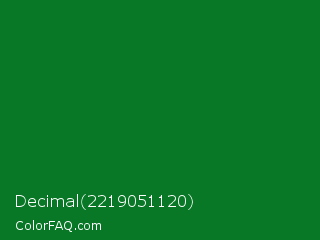 Decimal 2219051120 Color is a dark green color and the nearest color is La Salle Green #087830. Hex code #087726 and RGB value is rgb(8,119,38). In RGB color space, this color is composed of 3% red, 47% green, 15% blue, In CMYK color space, this color is composed of 93% cyan, 0% magenta, 68% yellow , 53% black , In HSL color space, this color has a hue angle of 136° , 87% saturation and 25% lightness.
