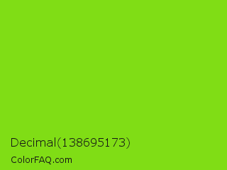Decimal 138695173 Color is a normal green color and the nearest color is Alien Armpit #84de02. Hex code #80dd15 and RGB value is rgb(128,221,21). In RGB color space, this color is composed of 50% red, 87% green, 8% blue, In CMYK color space, this color is composed of 42% cyan, 0% magenta, 90% yellow , 13% black , In HSL color space, this color has a hue angle of 88° , 83% saturation and 47% lightness.