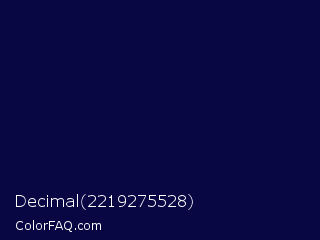 Decimal 2219275528 Color is a very dark indigo color and the nearest color is Stratos #000741. Hex code #090644 and RGB value is rgb(9,6,68). In RGB color space, this color is composed of 4% red, 2% green, 27% blue, In CMYK color space, this color is composed of 87% cyan, 91% magenta, 0% yellow , 73% black , In HSL color space, this color has a hue angle of 243° , 84% saturation and 15% lightness.