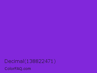 Decimal 138822471 Color is a normal violet color and the nearest color is Blue Violet #8a2be2. Hex code #8127db and RGB value is rgb(129,39,219). In RGB color space, this color is composed of 51% red, 15% green, 86% blue, In CMYK color space, this color is composed of 41% cyan, 82% magenta, 0% yellow , 14% black , In HSL color space, this color has a hue angle of 270° , 71% saturation and 51% lightness.