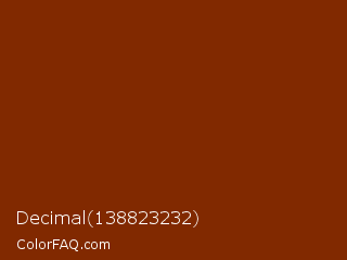 Decimal 138823232 Color is a dark orange color and the nearest color is Smokey Topaz #832a0d. Hex code #812900 and RGB value is rgb(129,41,0). In RGB color space, this color is composed of 51% red, 16% green, 0% blue, In CMYK color space, this color is composed of 0% cyan, 68% magenta, 100% yellow , 49% black , In HSL color space, this color has a hue angle of 19° , 100% saturation and 25% lightness.