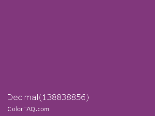 Decimal 138838856 Color is a normal magenta color and the nearest color is Razzmic Berry Crayola #843179. Hex code #81377c and RGB value is rgb(129,55,124). In RGB color space, this color is composed of 51% red, 22% green, 49% blue, In CMYK color space, this color is composed of 0% cyan, 57% magenta, 4% yellow , 49% black , In HSL color space, this color has a hue angle of 304° , 40% saturation and 36% lightness.