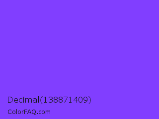 Decimal 138871409 Color is a light violet color and the nearest color is Blue Violet #8a2be2. Hex code #813eff and RGB value is rgb(129,62,255). In RGB color space, this color is composed of 51% red, 24% green, 100% blue, In CMYK color space, this color is composed of 49% cyan, 76% magenta, 0% yellow , 0% black , In HSL color space, this color has a hue angle of 261° , 100% saturation and 62% lightness.