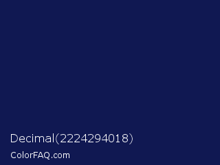 Decimal 2224294018 Color is a very dark blue color and the nearest color is Bunting #151f4c. Hex code #101852 and RGB value is rgb(16,24,82). In RGB color space, this color is composed of 6% red, 9% green, 32% blue, In CMYK color space, this color is composed of 80% cyan, 71% magenta, 0% yellow , 68% black , In HSL color space, this color has a hue angle of 233° , 67% saturation and 19% lightness.