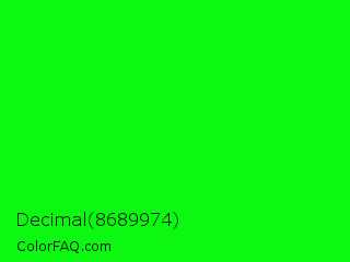 Decimal 8689974 Color is a normal green color and the nearest color is Green #00ff00. Hex code #0cf810 and RGB value is rgb(12,248,16). In RGB color space, this color is composed of 5% red, 97% green, 6% blue, In CMYK color space, this color is composed of 95% cyan, 0% magenta, 94% yellow , 3% black , In HSL color space, this color has a hue angle of 121° , 94% saturation and 51% lightness.