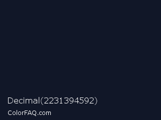 Decimal 2231394592 Color is a very dark blue color and the nearest color is Mirage #161928. Hex code #111728 and RGB value is rgb(17,23,40). In RGB color space, this color is composed of 7% red, 9% green, 16% blue, In CMYK color space, this color is composed of 58% cyan, 43% magenta, 0% yellow , 84% black , In HSL color space, this color has a hue angle of 224° , 40% saturation and 11% lightness.