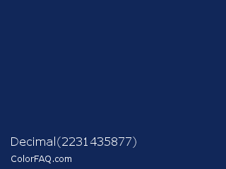 Decimal 2231435877 Color is a very dark blue color and the nearest color is Madison #09255d. Hex code #112759 and RGB value is rgb(17,39,89). In RGB color space, this color is composed of 7% red, 15% green, 35% blue, In CMYK color space, this color is composed of 81% cyan, 56% magenta, 0% yellow , 65% black , In HSL color space, this color has a hue angle of 222° , 68% saturation and 21% lightness.