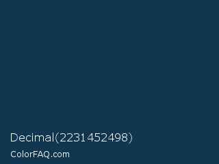 Decimal 2231452498 Color is a very dark blue color and the nearest color is Nile Blue #193751. Hex code #113750 and RGB value is rgb(17,55,80). In RGB color space, this color is composed of 7% red, 22% green, 31% blue, In CMYK color space, this color is composed of 79% cyan, 31% magenta, 0% yellow , 69% black , In HSL color space, this color has a hue angle of 204° , 65% saturation and 19% lightness.