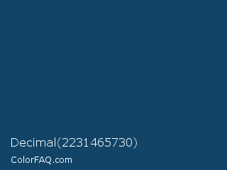 Decimal 2231465730 Color is a dark blue color and the nearest color is Regal Blue #013f6a. Hex code #114466 and RGB value is rgb(17,68,102). In RGB color space, this color is composed of 7% red, 27% green, 40% blue, In CMYK color space, this color is composed of 83% cyan, 33% magenta, 0% yellow , 60% black , In HSL color space, this color has a hue angle of 204° , 71% saturation and 23% lightness.