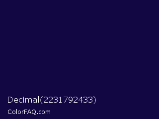 Decimal 2231792433 Color is a very dark indigo color and the nearest color is Tolopea #1b0245. Hex code #120643 and RGB value is rgb(18,6,67). In RGB color space, this color is composed of 7% red, 2% green, 26% blue, In CMYK color space, this color is composed of 73% cyan, 91% magenta, 0% yellow , 74% black , In HSL color space, this color has a hue angle of 252° , 84% saturation and 14% lightness.