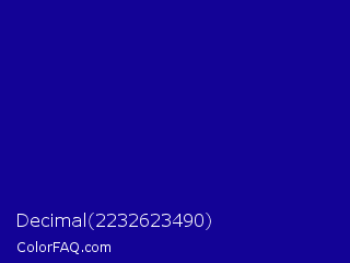 Decimal 2232623490 Color is a dark indigo color and the nearest color is Ultramarine #120a8f. Hex code #130396 and RGB value is rgb(19,3,150). In RGB color space, this color is composed of 7% red, 1% green, 59% blue, In CMYK color space, this color is composed of 87% cyan, 98% magenta, 0% yellow , 41% black , In HSL color space, this color has a hue angle of 247° , 96% saturation and 30% lightness.