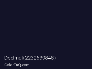 Decimal 2232639848 Color is a very dark blue color and the nearest color is Mirage #161928. Hex code #131328 and RGB value is rgb(19,19,40). In RGB color space, this color is composed of 7% red, 7% green, 16% blue, In CMYK color space, this color is composed of 53% cyan, 53% magenta, 0% yellow , 84% black , In HSL color space, this color has a hue angle of 240° , 36% saturation and 12% lightness.
