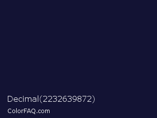 Decimal 2232639872 Color is a very dark blue color and the nearest color is Haiti #1b1035. Hex code #131334 and RGB value is rgb(19,19,52). In RGB color space, this color is composed of 7% red, 7% green, 20% blue, In CMYK color space, this color is composed of 63% cyan, 63% magenta, 0% yellow , 80% black , In HSL color space, this color has a hue angle of 240° , 46% saturation and 14% lightness.