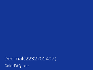 Decimal 2232701497 Color is a normal blue color and the nearest color is Torea Bay #0f2d9e. Hex code #133697 and RGB value is rgb(19,54,151). In RGB color space, this color is composed of 7% red, 21% green, 59% blue, In CMYK color space, this color is composed of 87% cyan, 64% magenta, 0% yellow , 41% black , In HSL color space, this color has a hue angle of 224° , 78% saturation and 33% lightness.