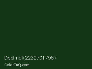 Decimal 2232701798 Color is a very dark green color and the nearest color is Palm Leaf #19330e. Hex code #133716 and RGB value is rgb(19,55,22). In RGB color space, this color is composed of 7% red, 22% green, 9% blue, In CMYK color space, this color is composed of 65% cyan, 0% magenta, 60% yellow , 78% black , In HSL color space, this color has a hue angle of 125° , 49% saturation and 15% lightness.