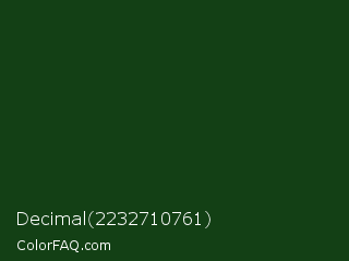 Decimal 2232710761 Color is a very dark green color and the nearest color is Dark Fern #0a480d. Hex code #134015 and RGB value is rgb(19,64,21). In RGB color space, this color is composed of 7% red, 25% green, 8% blue, In CMYK color space, this color is composed of 70% cyan, 0% magenta, 67% yellow , 75% black , In HSL color space, this color has a hue angle of 123° , 54% saturation and 16% lightness.
