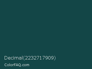 Decimal 2232717909 Color is a very dark cyan color and the nearest color is MSU Green #18453b. Hex code #134647 and RGB value is rgb(19,70,71). In RGB color space, this color is composed of 7% red, 27% green, 28% blue, In CMYK color space, this color is composed of 73% cyan, 1% magenta, 0% yellow , 72% black , In HSL color space, this color has a hue angle of 181° , 58% saturation and 18% lightness.