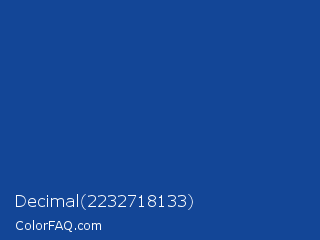 Decimal 2232718133 Color is a normal blue color and the nearest color is Yale Blue #0f4d92. Hex code #134697 and RGB value is rgb(19,70,151). In RGB color space, this color is composed of 7% red, 27% green, 59% blue, In CMYK color space, this color is composed of 87% cyan, 54% magenta, 0% yellow , 41% black , In HSL color space, this color has a hue angle of 217° , 78% saturation and 33% lightness.