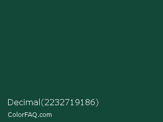 Decimal 2232719186 Color is a very dark green color and the nearest color is MSU Green #18453b. Hex code #134838 and RGB value is rgb(19,72,56). In RGB color space, this color is composed of 7% red, 28% green, 22% blue, In CMYK color space, this color is composed of 74% cyan, 0% magenta, 22% yellow , 72% black , In HSL color space, this color has a hue angle of 162° , 58% saturation and 18% lightness.
