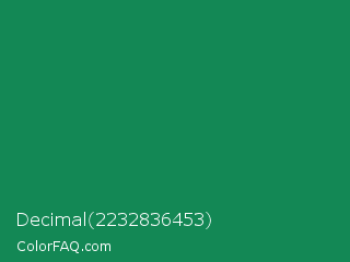 Decimal 2232836453 Color is a dark green color and the nearest color is Salem #097f4b. Hex code #138855 and RGB value is rgb(19,136,85). In RGB color space, this color is composed of 7% red, 53% green, 33% blue, In CMYK color space, this color is composed of 86% cyan, 0% magenta, 38% yellow , 47% black , In HSL color space, this color has a hue angle of 154° , 75% saturation and 30% lightness.
