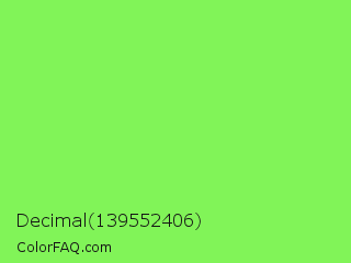 Decimal 139552406 Color is a light green color and the nearest color is Kiwi #8ee53f. Hex code #81f458 and RGB value is rgb(129,244,88). In RGB color space, this color is composed of 51% red, 96% green, 35% blue, In CMYK color space, this color is composed of 47% cyan, 0% magenta, 64% yellow , 4% black , In HSL color space, this color has a hue angle of 104° , 88% saturation and 65% lightness.