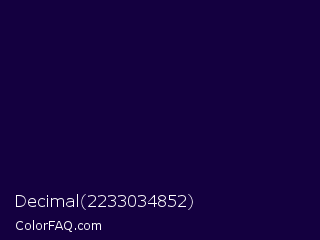 Decimal 2233034852 Color is a very dark indigo color and the nearest color is Tolopea #1b0245. Hex code #140040 and RGB value is rgb(20,0,64). In RGB color space, this color is composed of 8% red, 0% green, 25% blue, In CMYK color space, this color is composed of 69% cyan, 100% magenta, 0% yellow , 75% black , In HSL color space, this color has a hue angle of 259° , 100% saturation and 13% lightness.