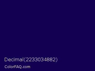 Decimal 2233034882 Color is a very dark indigo color and the nearest color is Tolopea #1b0245. Hex code #140052 and RGB value is rgb(20,0,82). In RGB color space, this color is composed of 8% red, 0% green, 32% blue, In CMYK color space, this color is composed of 76% cyan, 100% magenta, 0% yellow , 68% black , In HSL color space, this color has a hue angle of 255° , 100% saturation and 16% lightness.