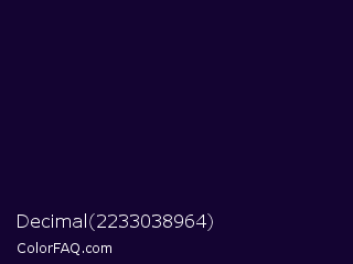 Decimal 2233038964 Color is a very dark violet color and the nearest color is Black Rock #0d0332. Hex code #140432 and RGB value is rgb(20,4,50). In RGB color space, this color is composed of 8% red, 2% green, 20% blue, In CMYK color space, this color is composed of 60% cyan, 92% magenta, 0% yellow , 80% black , In HSL color space, this color has a hue angle of 261° , 85% saturation and 11% lightness.