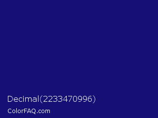 Decimal 2233470996 Color is a dark indigo color and the nearest color is Deep Koamaru #1b127b. Hex code #141076 and RGB value is rgb(20,16,118). In RGB color space, this color is composed of 8% red, 6% green, 46% blue, In CMYK color space, this color is composed of 83% cyan, 86% magenta, 0% yellow , 54% black , In HSL color space, this color has a hue angle of 242° , 76% saturation and 26% lightness.