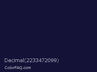 Decimal 2233472099 Color is a very dark indigo color and the nearest color is Haiti #1b1035. Hex code #141237 and RGB value is rgb(20,18,55). In RGB color space, this color is composed of 8% red, 7% green, 22% blue, In CMYK color space, this color is composed of 64% cyan, 67% magenta, 0% yellow , 78% black , In HSL color space, this color has a hue angle of 243° , 51% saturation and 14% lightness.