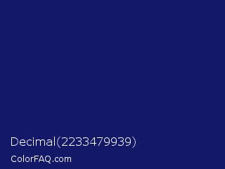 Decimal 2233479939 Color is a dark blue color and the nearest color is Lucky Point #1a1a68. Hex code #141967 and RGB value is rgb(20,25,103). In RGB color space, this color is composed of 8% red, 10% green, 40% blue, In CMYK color space, this color is composed of 81% cyan, 76% magenta, 0% yellow , 60% black , In HSL color space, this color has a hue angle of 236° , 67% saturation and 24% lightness.
