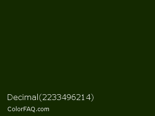 Decimal 2233496214 Color is a almost black green color and the nearest color is Deep Forest Green #182d09. Hex code #142900 and RGB value is rgb(20,41,0). In RGB color space, this color is composed of 8% red, 16% green, 0% blue, In CMYK color space, this color is composed of 51% cyan, 0% magenta, 100% yellow , 84% black , In HSL color space, this color has a hue angle of 91° , 100% saturation and 8% lightness.