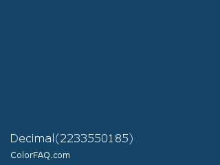 Decimal 2233550185 Color is a dark blue color and the nearest color is Regal Blue #013f6a. Hex code #144569 and RGB value is rgb(20,69,105). In RGB color space, this color is composed of 8% red, 27% green, 41% blue, In CMYK color space, this color is composed of 81% cyan, 34% magenta, 0% yellow , 59% black , In HSL color space, this color has a hue angle of 205° , 68% saturation and 25% lightness.