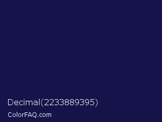 Decimal 2233889395 Color is a very dark indigo color and the nearest color is Bunting #151f4c. Hex code #151349 and RGB value is rgb(21,19,73). In RGB color space, this color is composed of 8% red, 7% green, 29% blue, In CMYK color space, this color is composed of 71% cyan, 74% magenta, 0% yellow , 71% black , In HSL color space, this color has a hue angle of 242° , 59% saturation and 18% lightness.